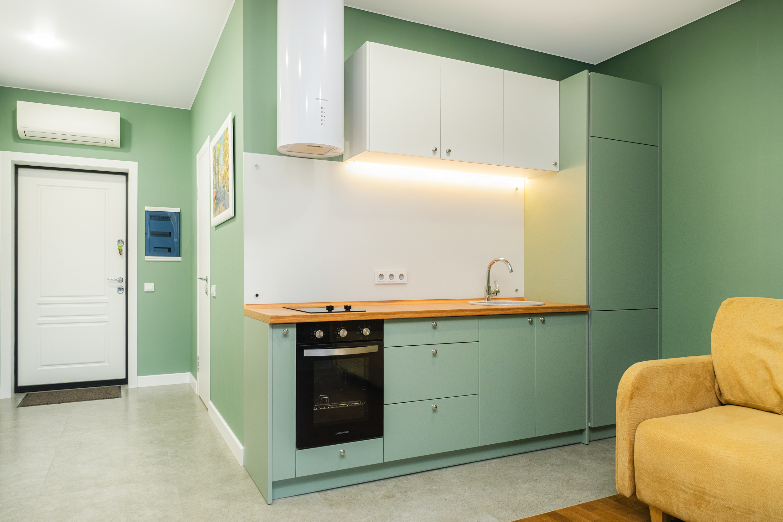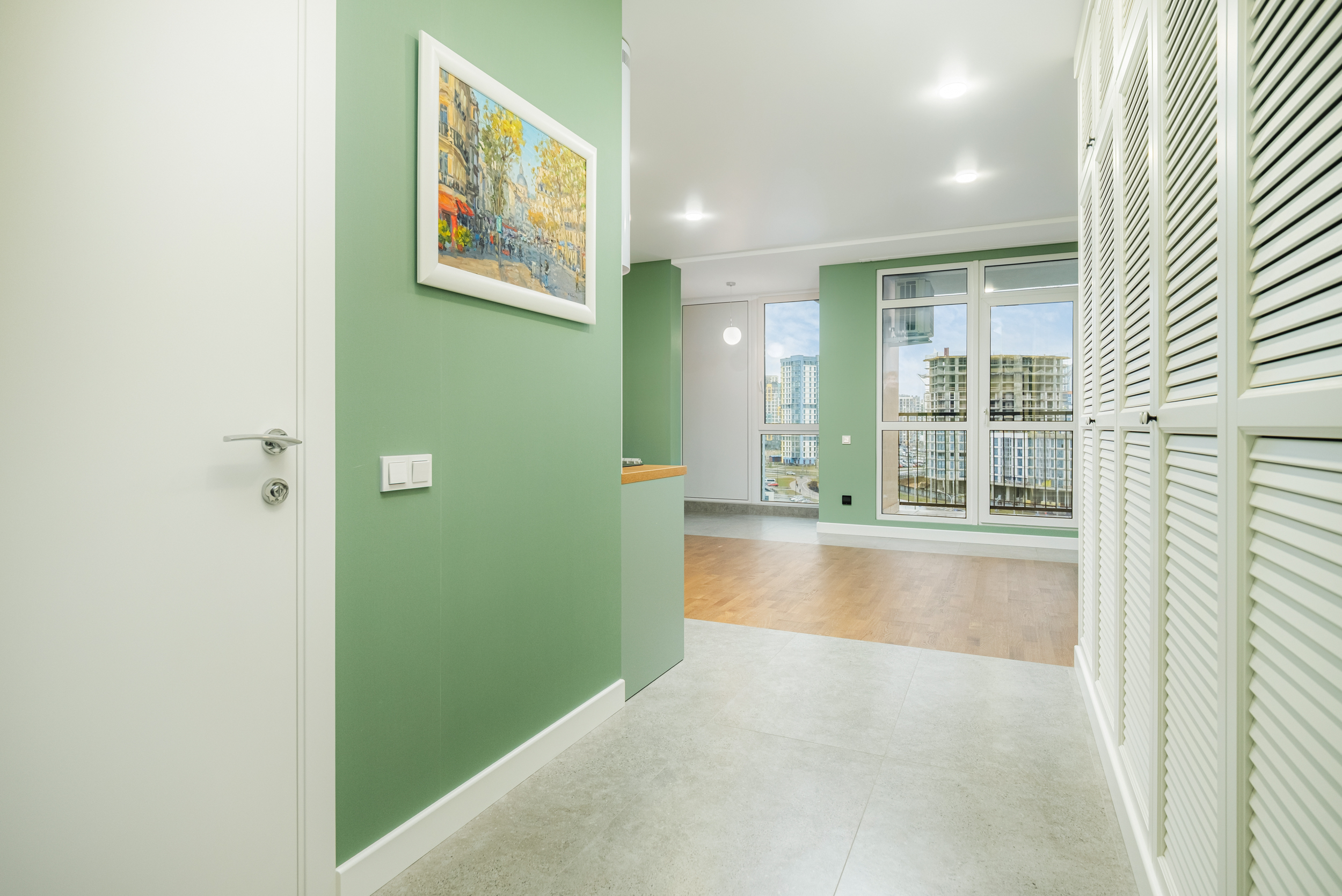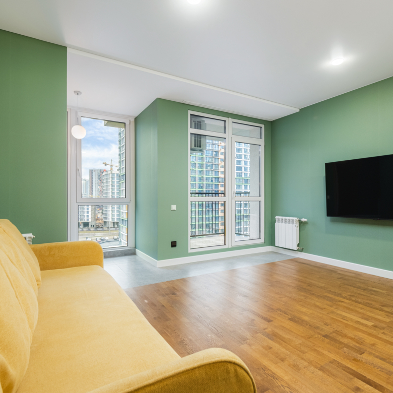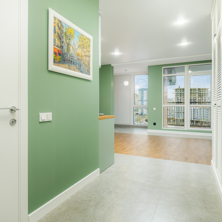 В квартире выполнен стильный ремонт в светлых тонах с добавкой зеленого оттенка «цвета оливки», который создает особую творческую атмосферу, придает современность и элегантность, окутывает теплом и уютом. Ей присущ особый шарм. В этой квартире ощущается гармония и спокойствие. Она обладает успокаивающим действием, снимает напряжение, вызывает чувство безопасности и связи с природой.