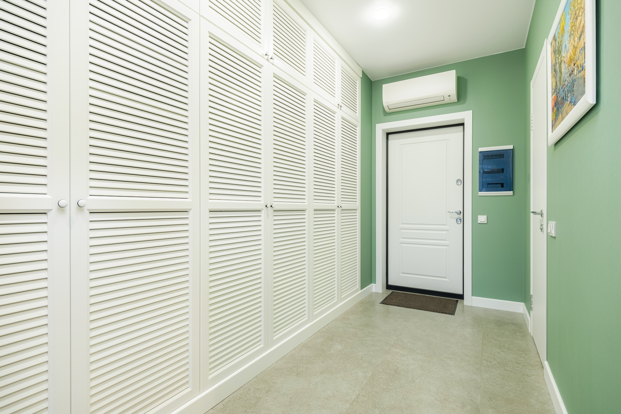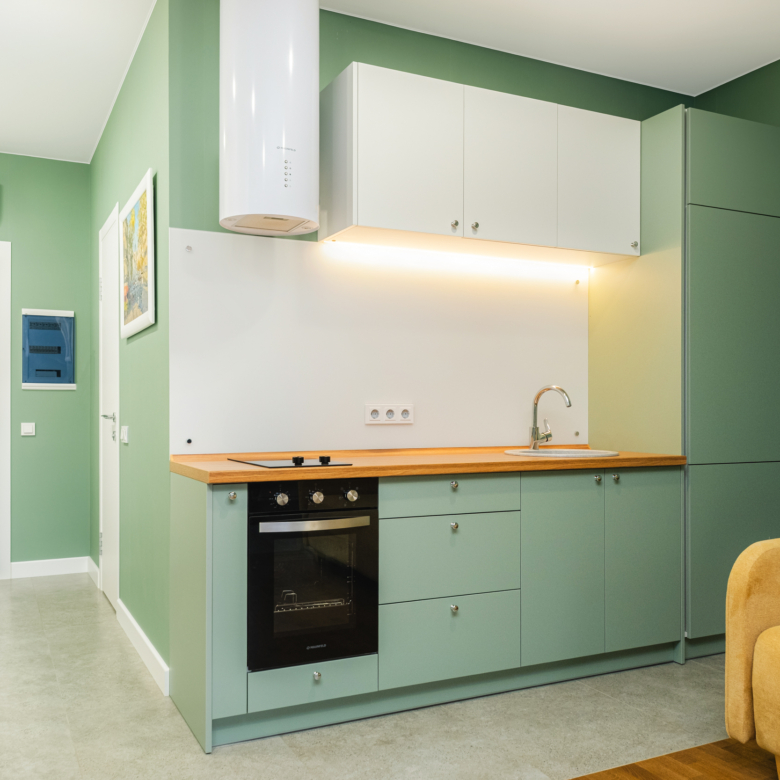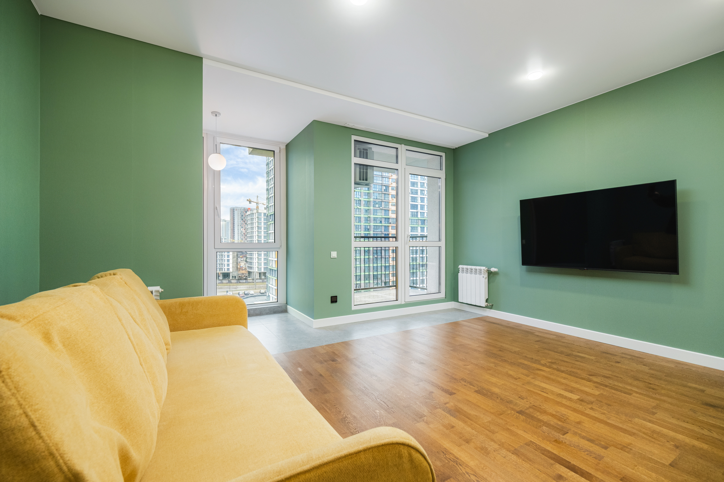 В квартире выполнен стильный ремонт в светлых тонах с добавкой зеленого оттенка «цвета оливки», который создает особую творческую атмосферу, придает современность и элегантность, окутывает теплом и уютом. Ей присущ особый шарм. В этой квартире ощущается гармония и спокойствие. Она обладает успокаивающим действием, снимает напряжение, вызывает чувство безопасности и связи с природой.