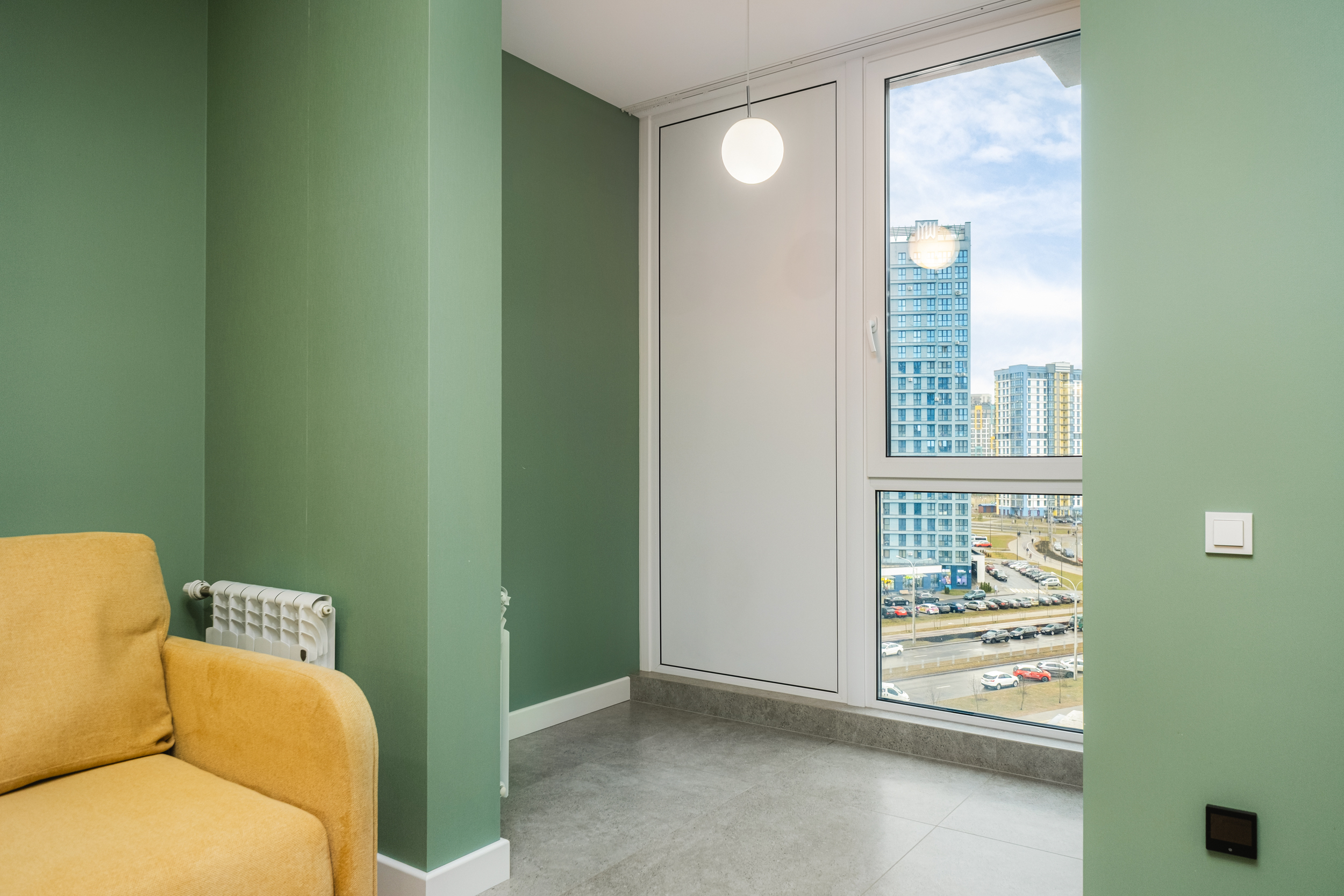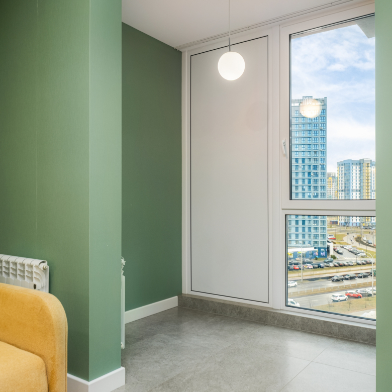Квартира расположена на 8/21 этаже панельного дома, что обеспечивает прекрасный вид из окна, достаточно естественного света. Панорамное остекление и балкон создают просторную и светлую атмосферу. Потолки — 2,7 м.