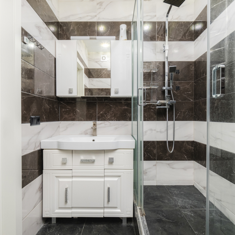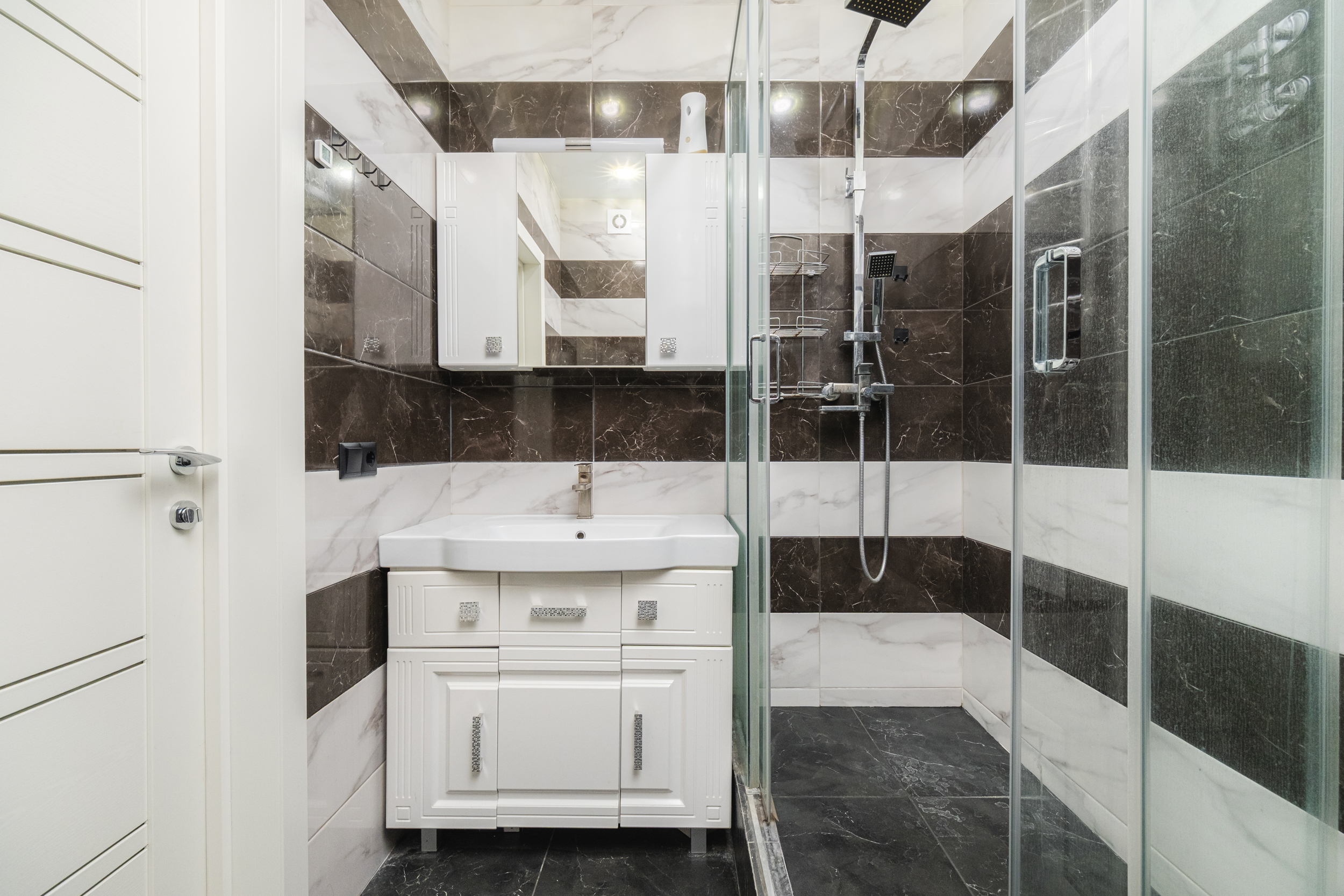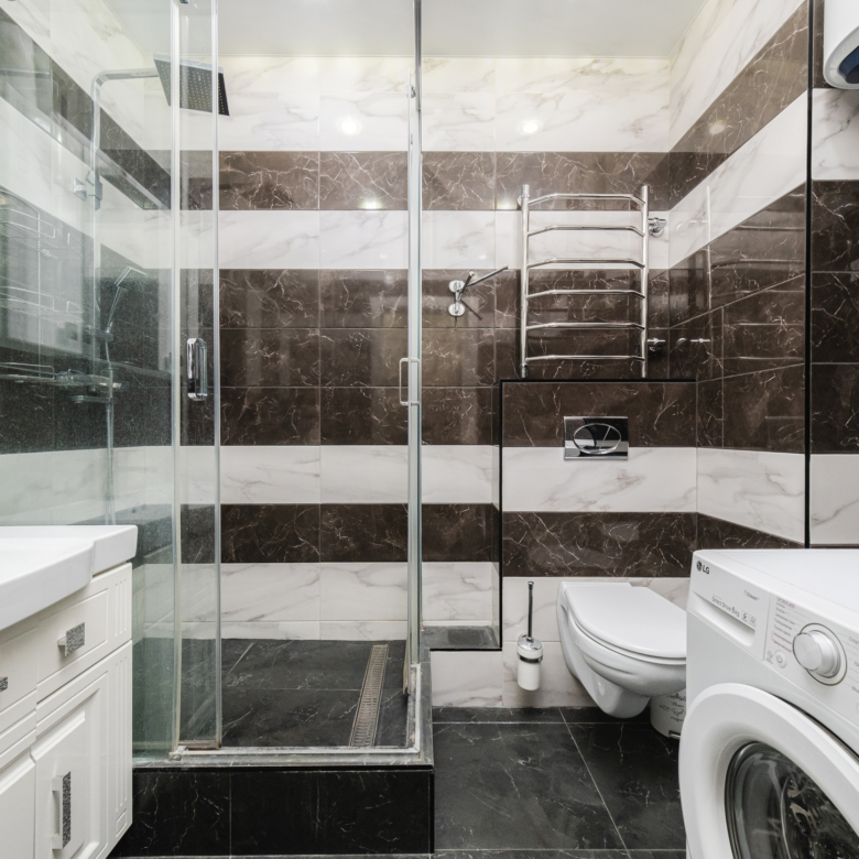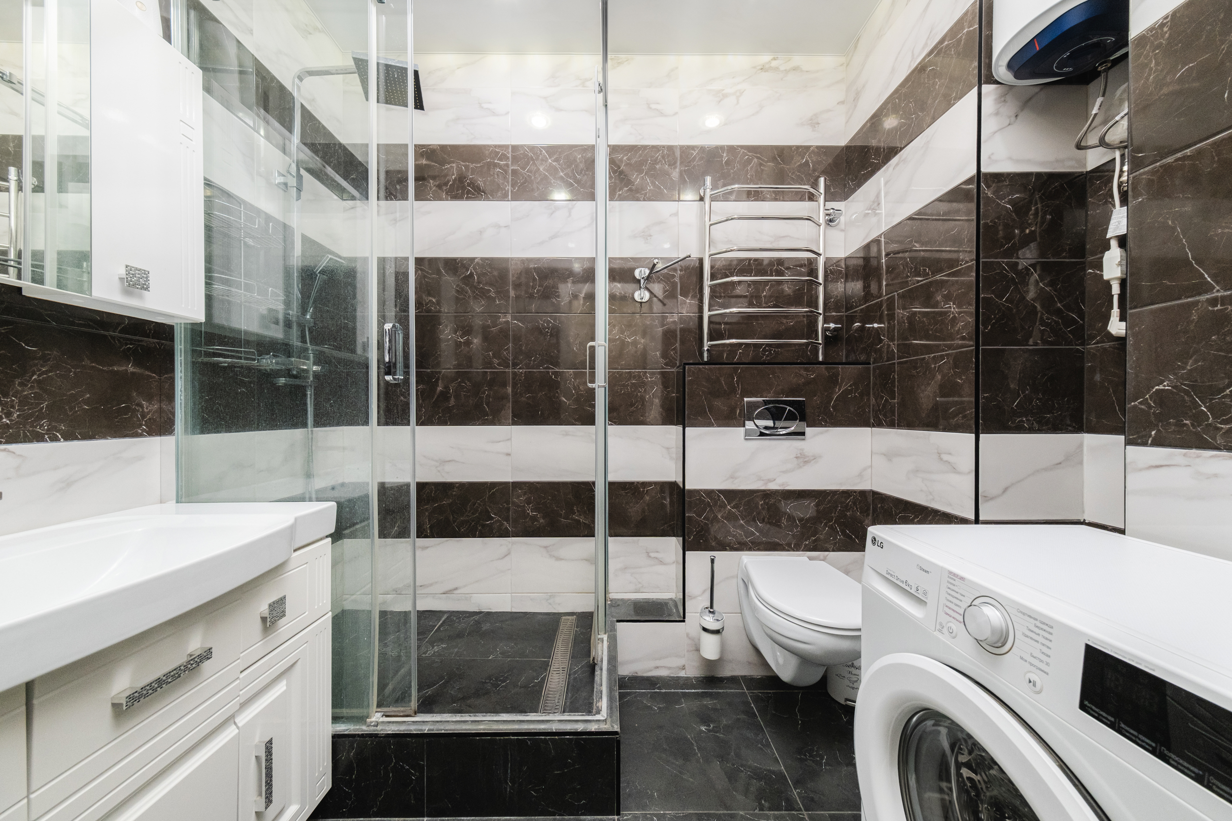 В санузле душевая, бойлер, стиральная машина и полочки для хранения.