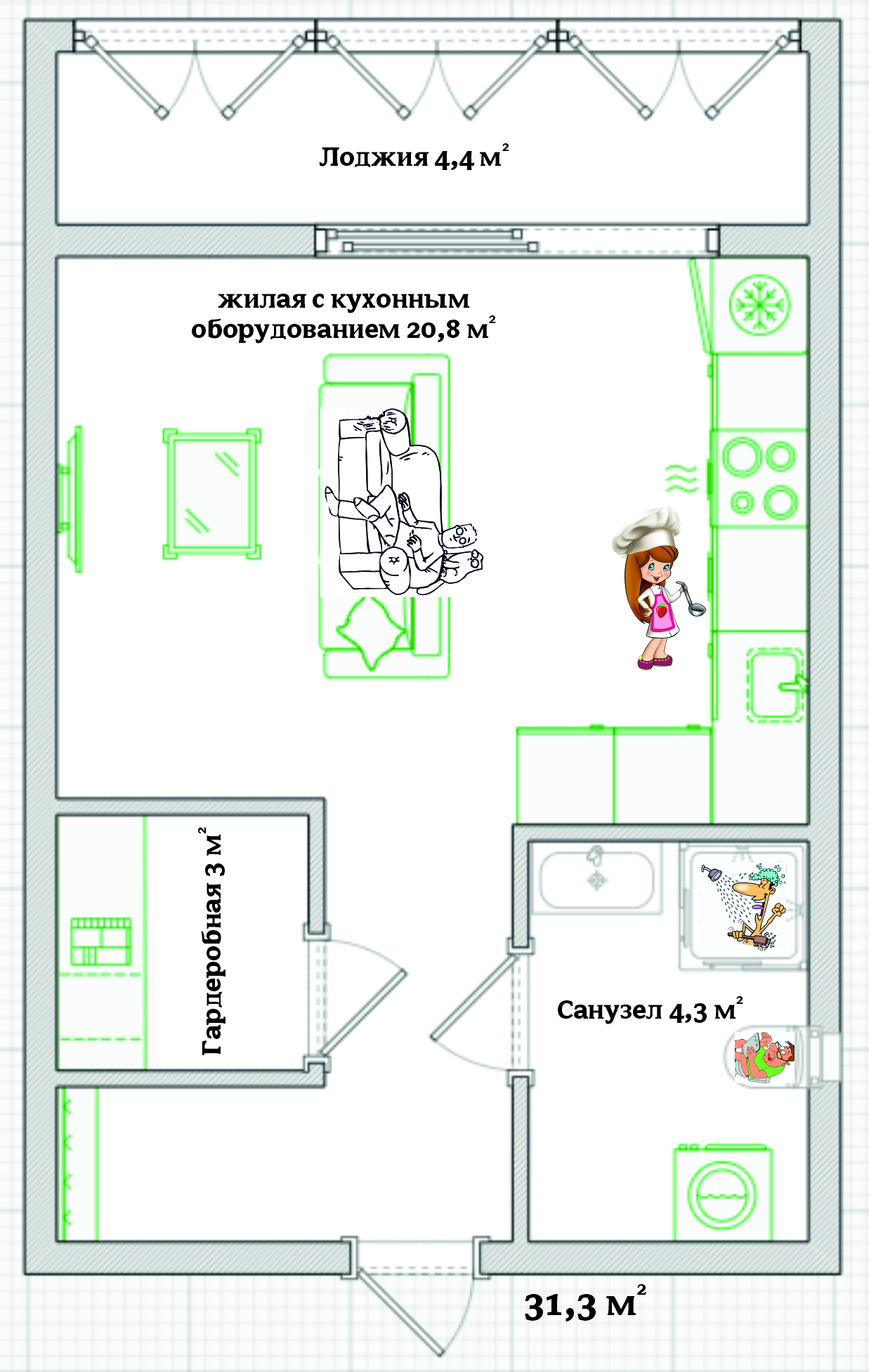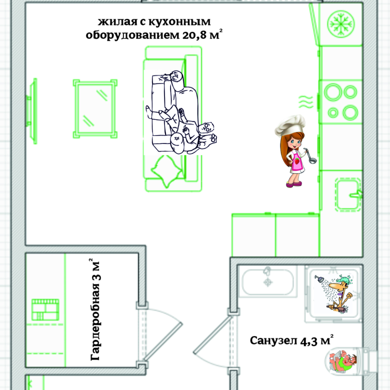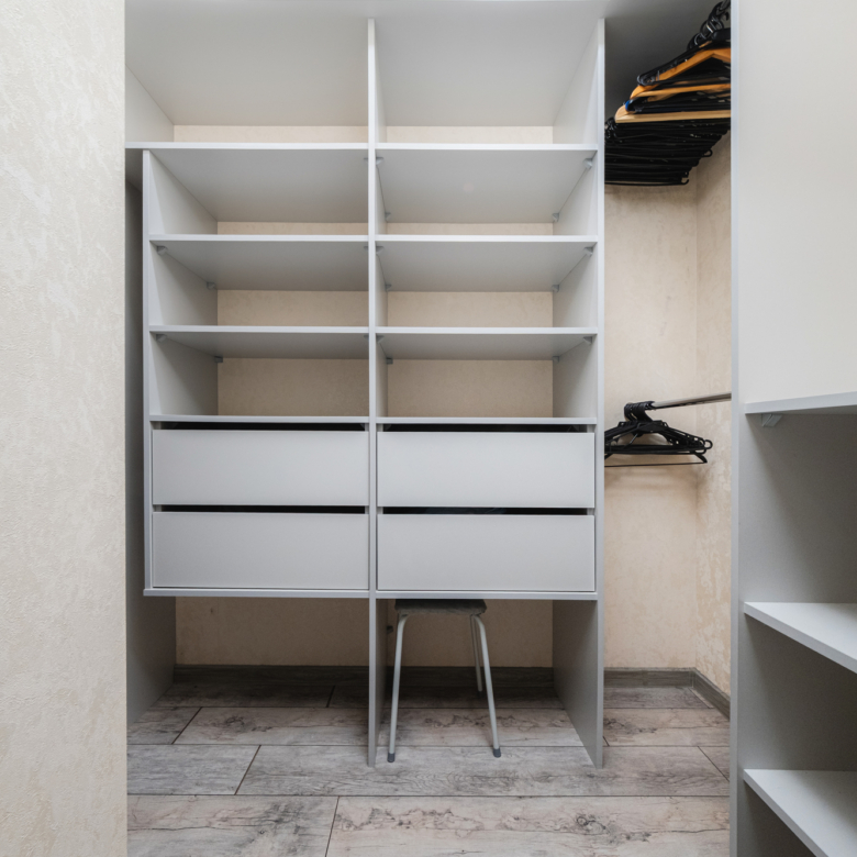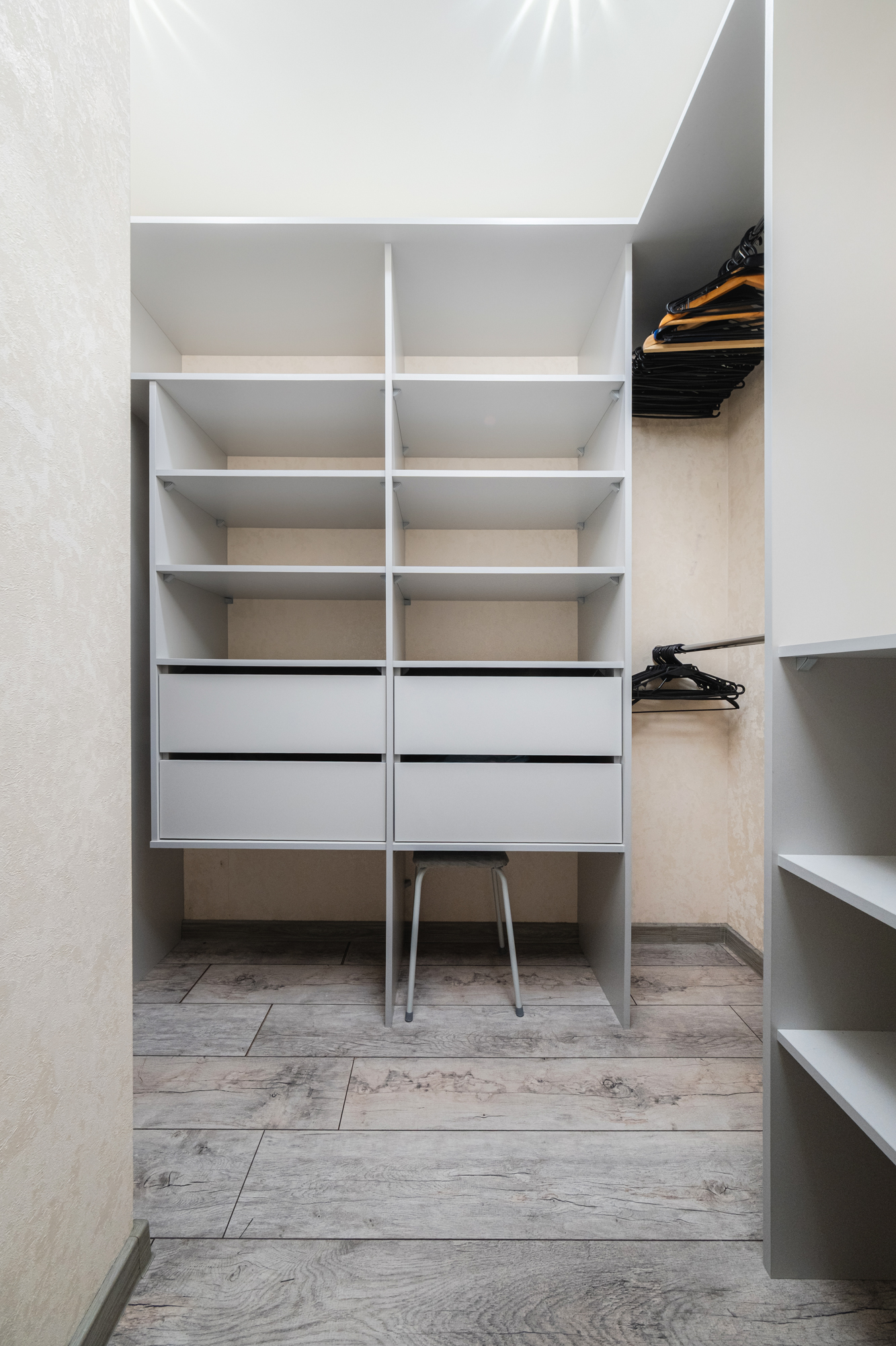 Отдельно отгорожена гардеробная, в которой можно уместить всё, что неугодно глазу.