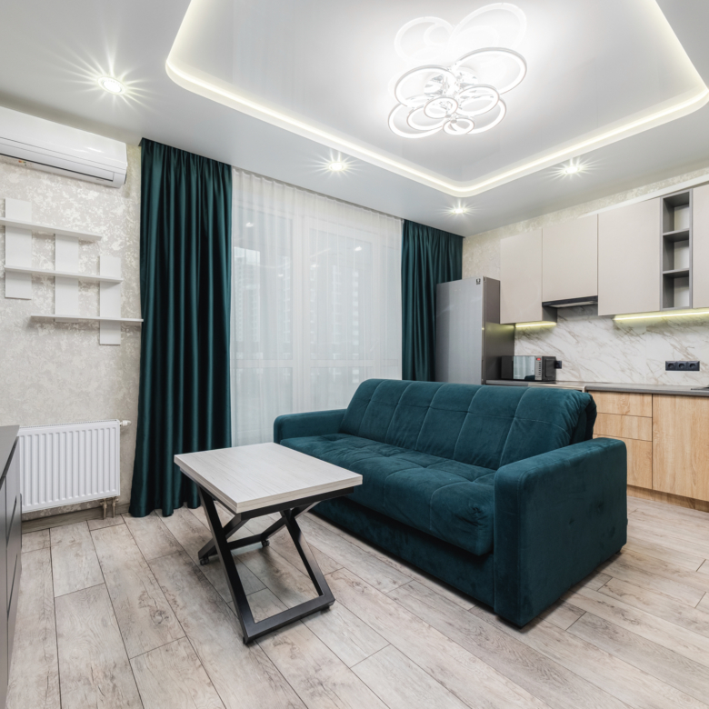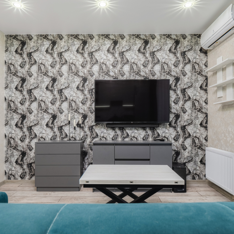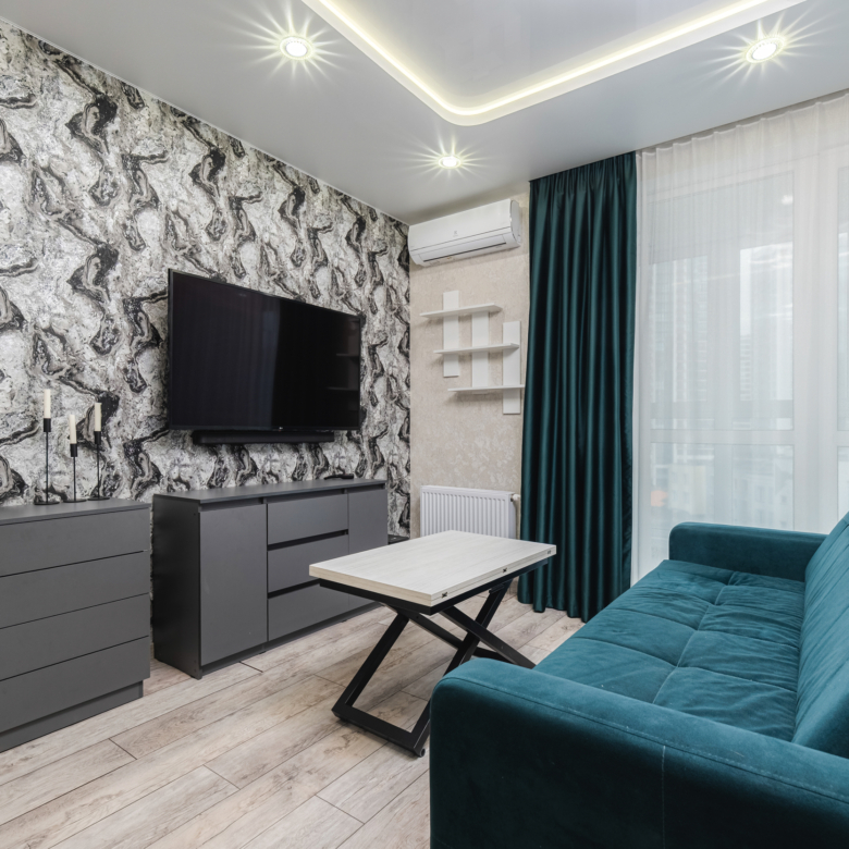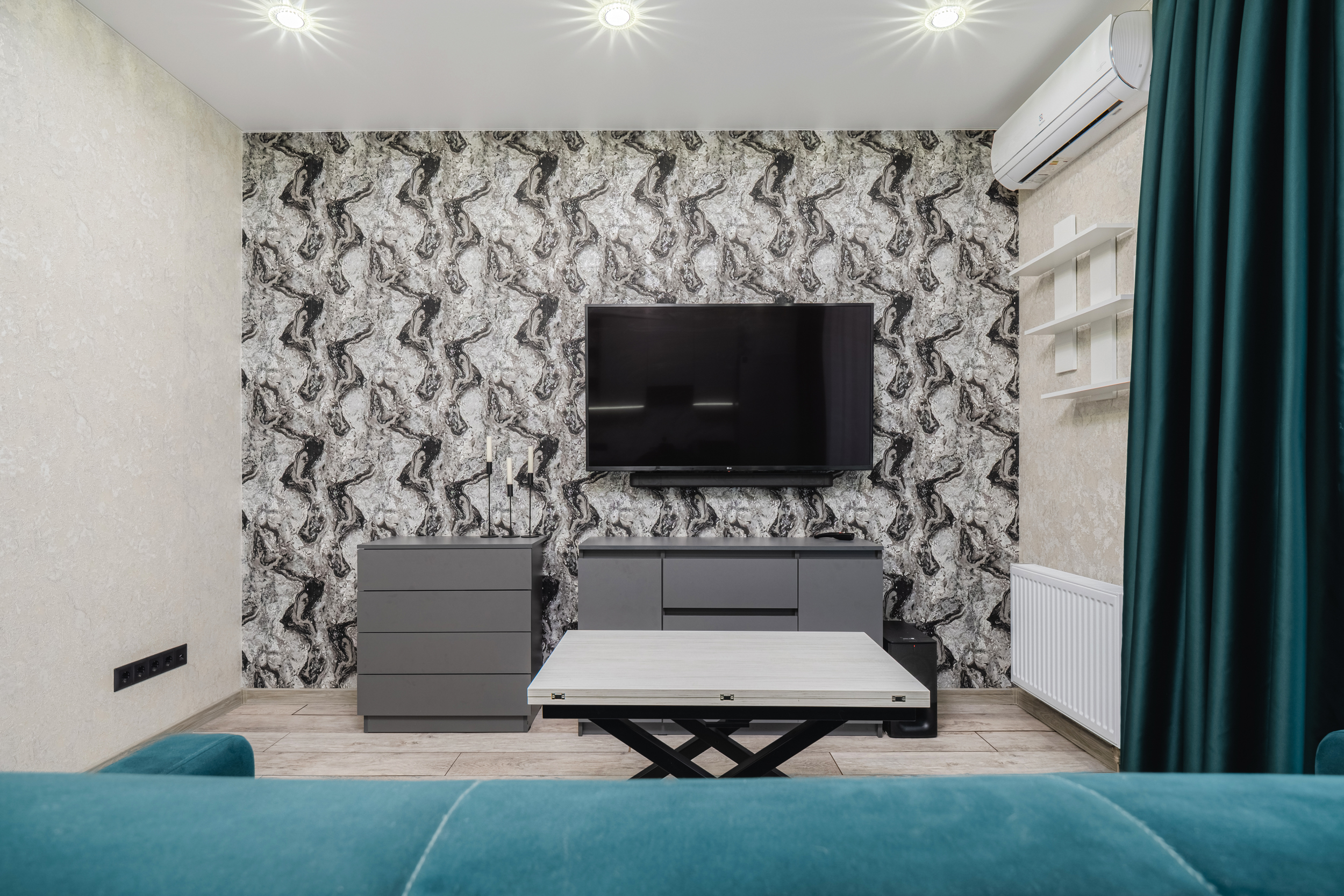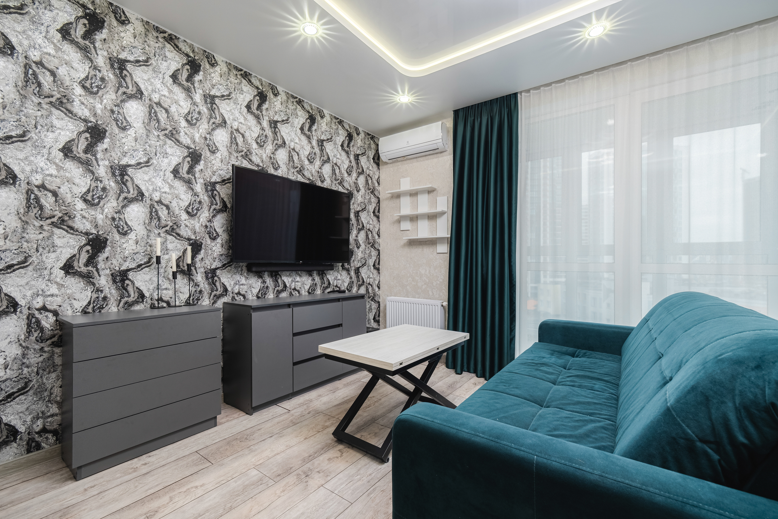 В комнате на полу ламинат, кондиционер, спальное место, телевизор, журнальный столик, функциональные комоды.