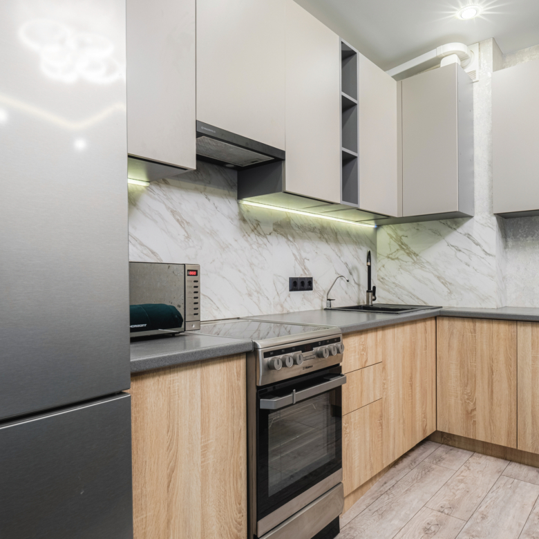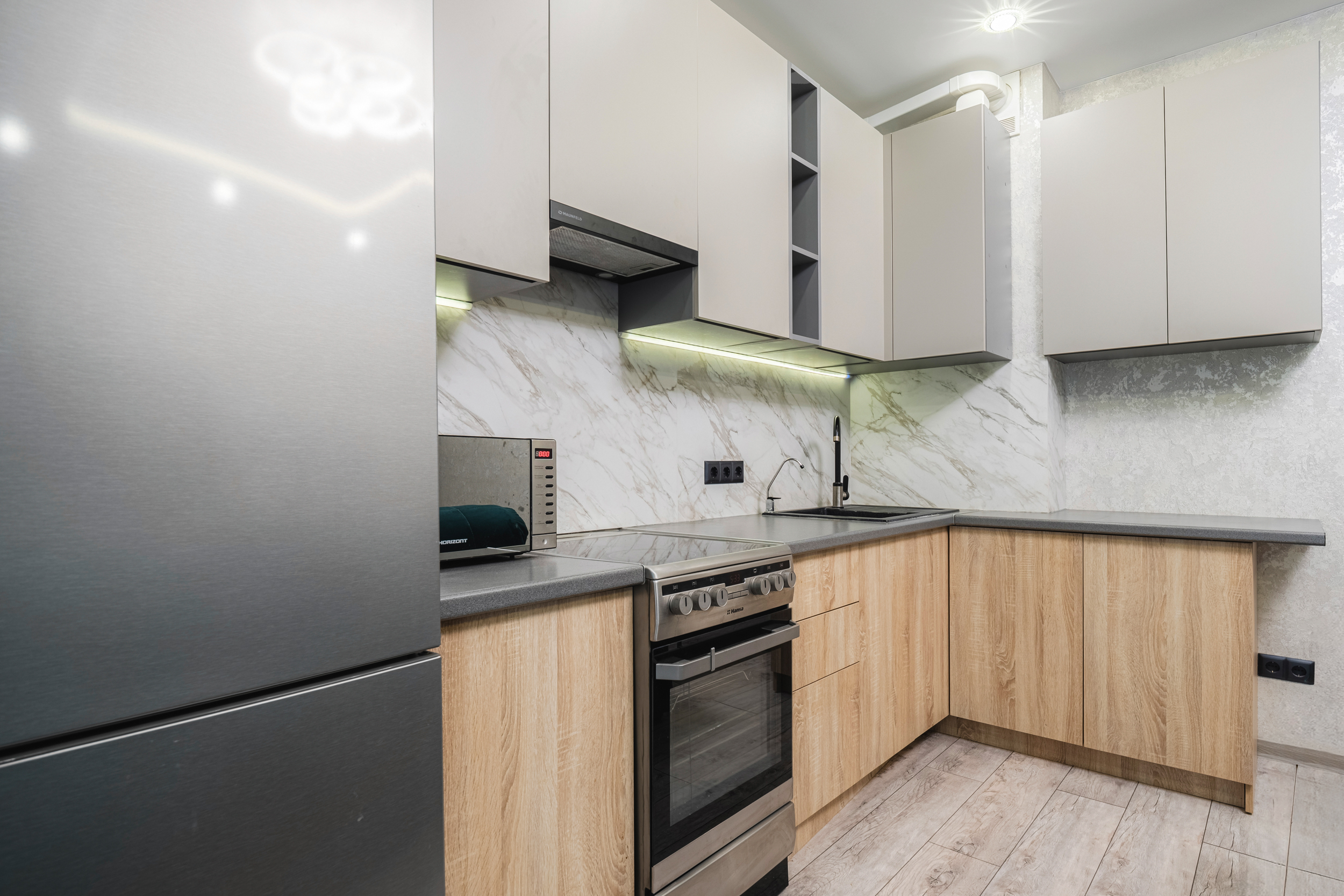 Современный кухонный гарнитур, отдельностоящий холодильник, микроволновка, вытяжка, фильтр для воды.