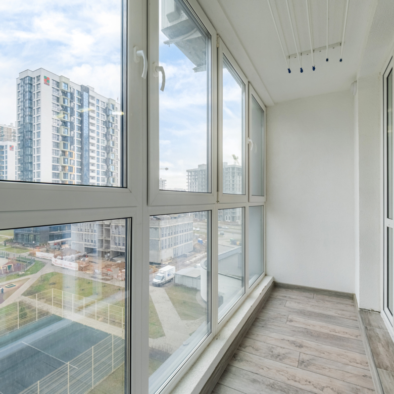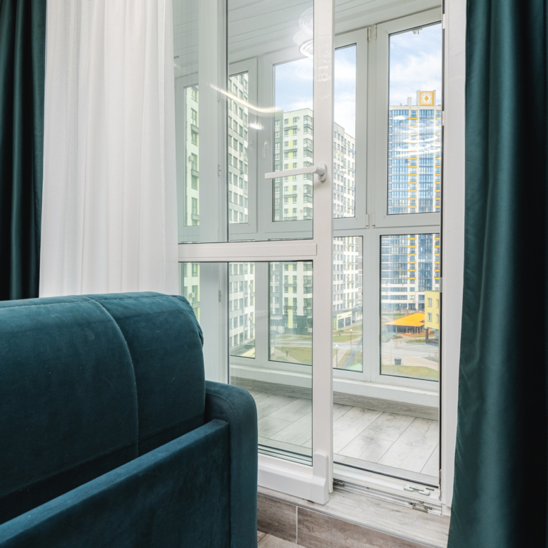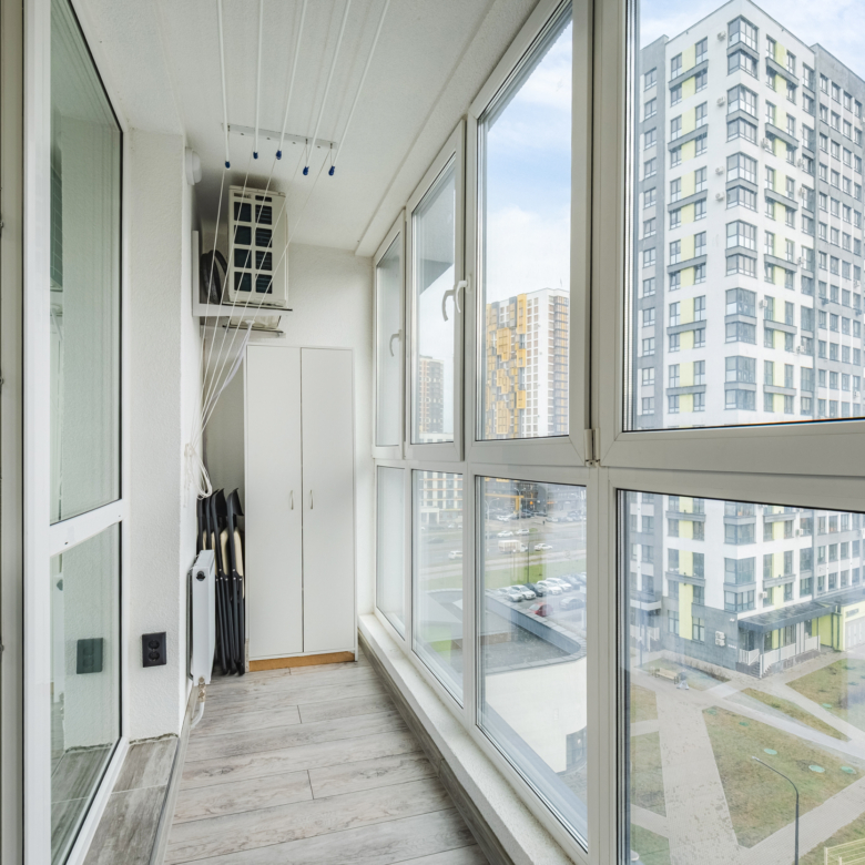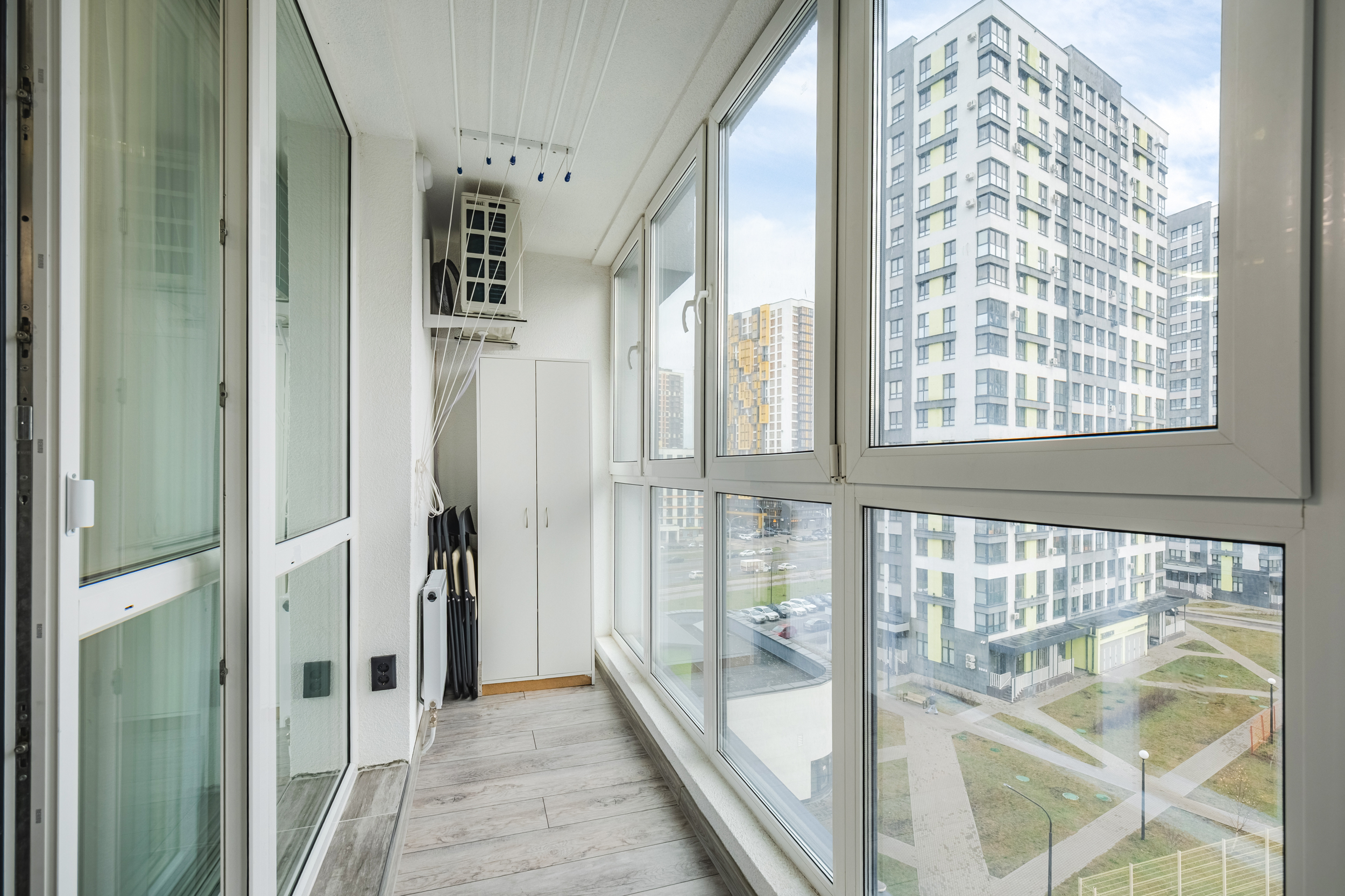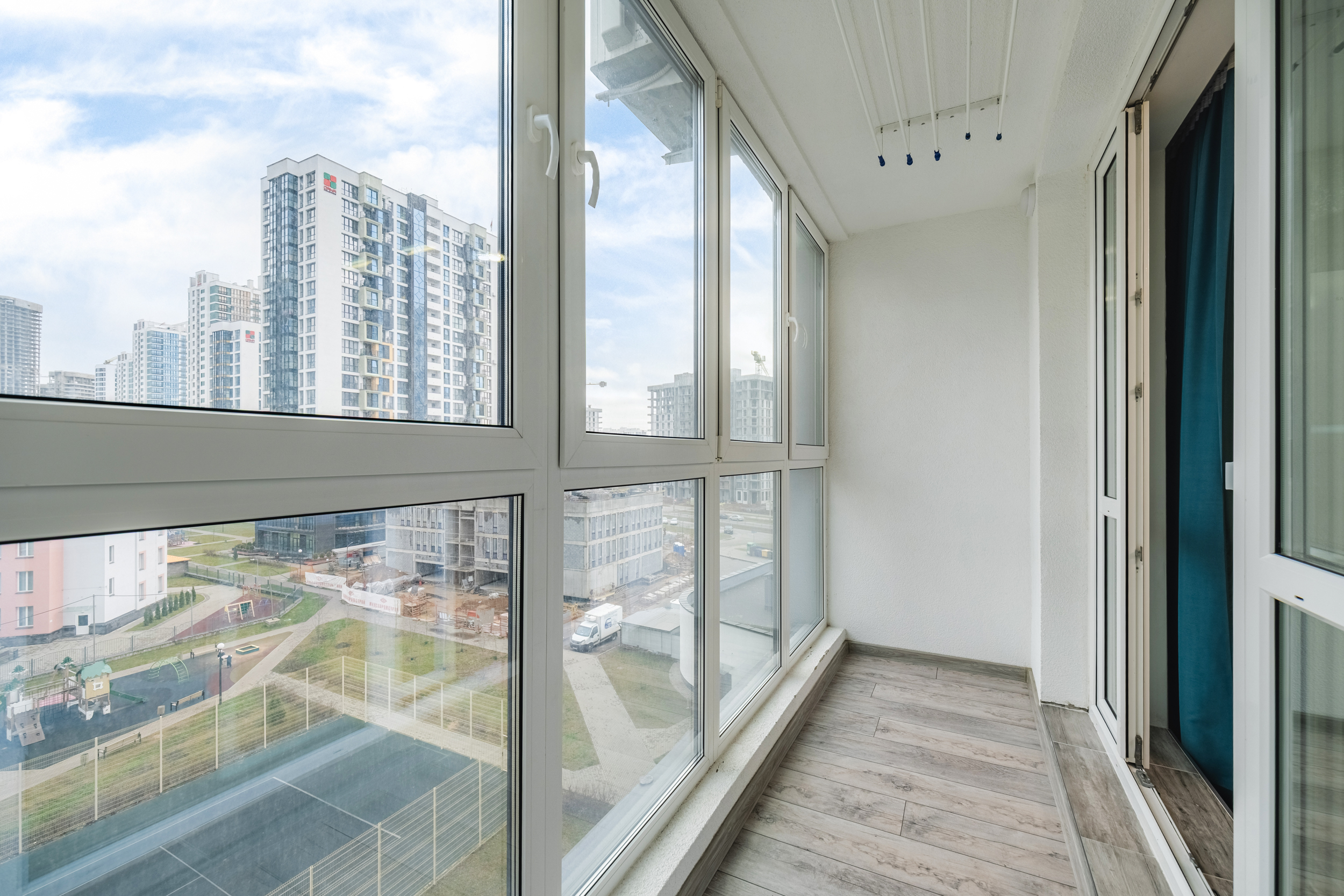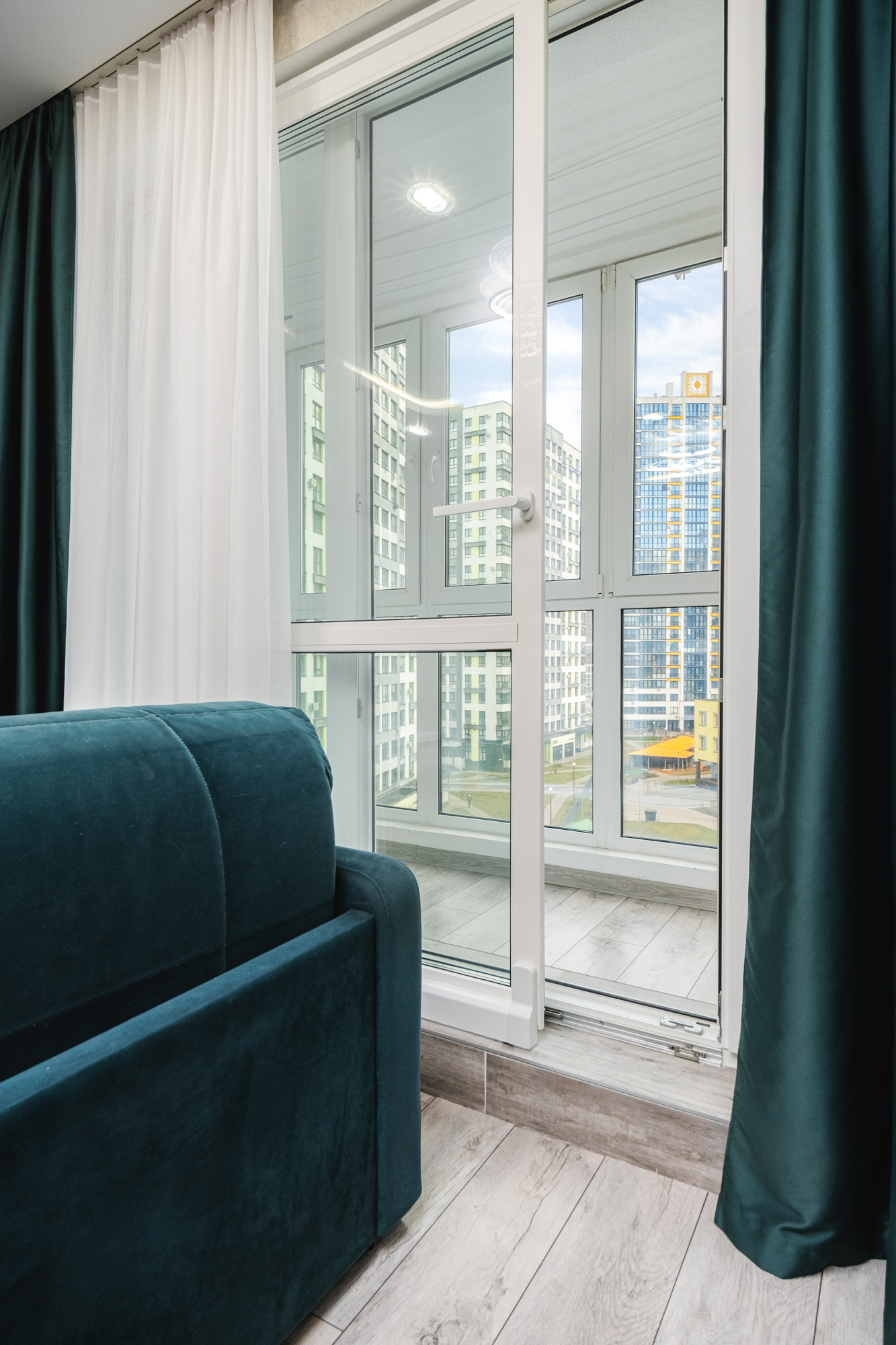 Квартира-студия с хорошим ремонтом панорамными окнами и застекленной лоджией. Окна выходят во двор.
